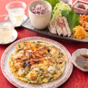 旬のアサリの蒸し汁も白玉粉入りの生地に混ぜ込み入れ、エビ、イカをのせて焼き上げた、魚介の旨みがたっぷりのチヂミです。もっちりとした食感が後を引きます。 |