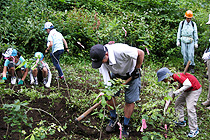 植樹体験:苗畑で育てた苗木を掘り起こし、植樹地の残念ながら枯れてしまったスペースへ補植します。 |