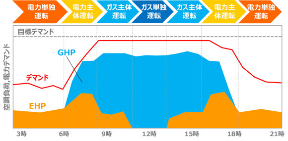 例えば、朝や夕方、夜間などにおいて電力需要が小さく電気料金が安価な領域ではEHP中心に運転し、電力需要が大きくなる日中はGHP中心に運転するなど、状況に応じて運転比率を変えることで、お客さまの使い方に合わせた、省エネ、省コストを実現します※4。