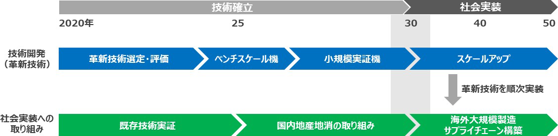 2030年までに革新技術の開発と小規模実証を完了し、2030年代以降早期に革新技術を順次展開していきます。