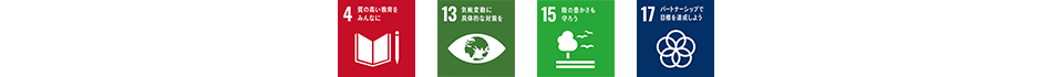 この17の目標の中でも共栄の循環で「4.質の高い教育をみんなに」、自然の循環で「13.気候変動に具体的な対策を」、経済の循環で「15.陸の豊かさも守ろう」、知の循環で「17.パートナーシップで目標を達成しよう」に貢献しています。