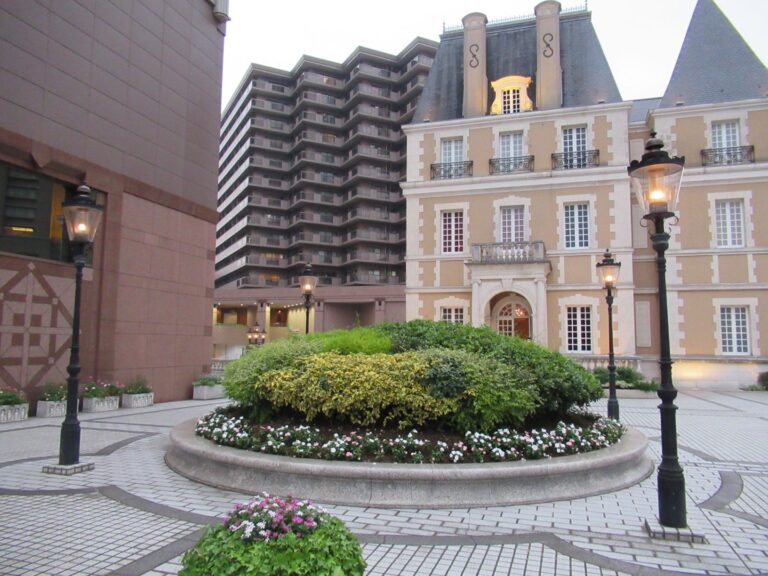 「ジョエル・ロブション」建物正面右側の花壇。 花壇を取り囲むように4基のガス灯が設置されています。