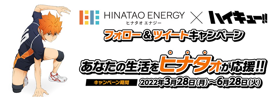 「ヒナタオエナジー」と人気アニメ「ハイキュー!!」は<主人公の“日向”と“ヒナタオ”という社名><でんきの明るさ&パワーと日向をはじめとしたキャラクターたちの明るさ&パワー>など共通点がたくさんあり、相性が抜群であることから、「ハイキュ—!!」を応援するあなたを応援する「ヒナタオエナジー×ハイキュー!!コラボキャンぺーン」を開催しました。