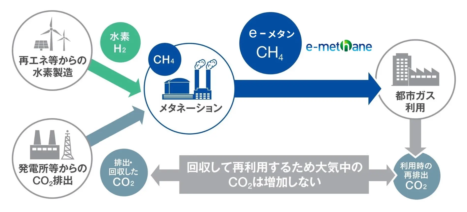 東京ガスは、メタネーションによるカーボンニュートラルの実現を積極的に推進しており、日本政府が掲げる「2050年カーボンニュートラル」を見据え、2030年までにガス供給量の1%をe-メタン(合成メタン)に置き換えることを目標としています。