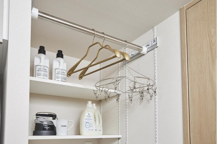 更に洗濯機置場の上部には、可動式のハンガーパイプを設け、洗濯物の一時干しスペースとしています。