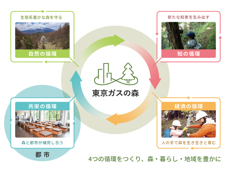 東京ガスグループが目指すのは「自然の循環」「知の循環」「経済の循環」「共栄の循環」の4つの循環を、森を中心にして創り出すこと。今後も計画的に管理することで、大きく木々が育つ豊かな生態系の森にしていきます。