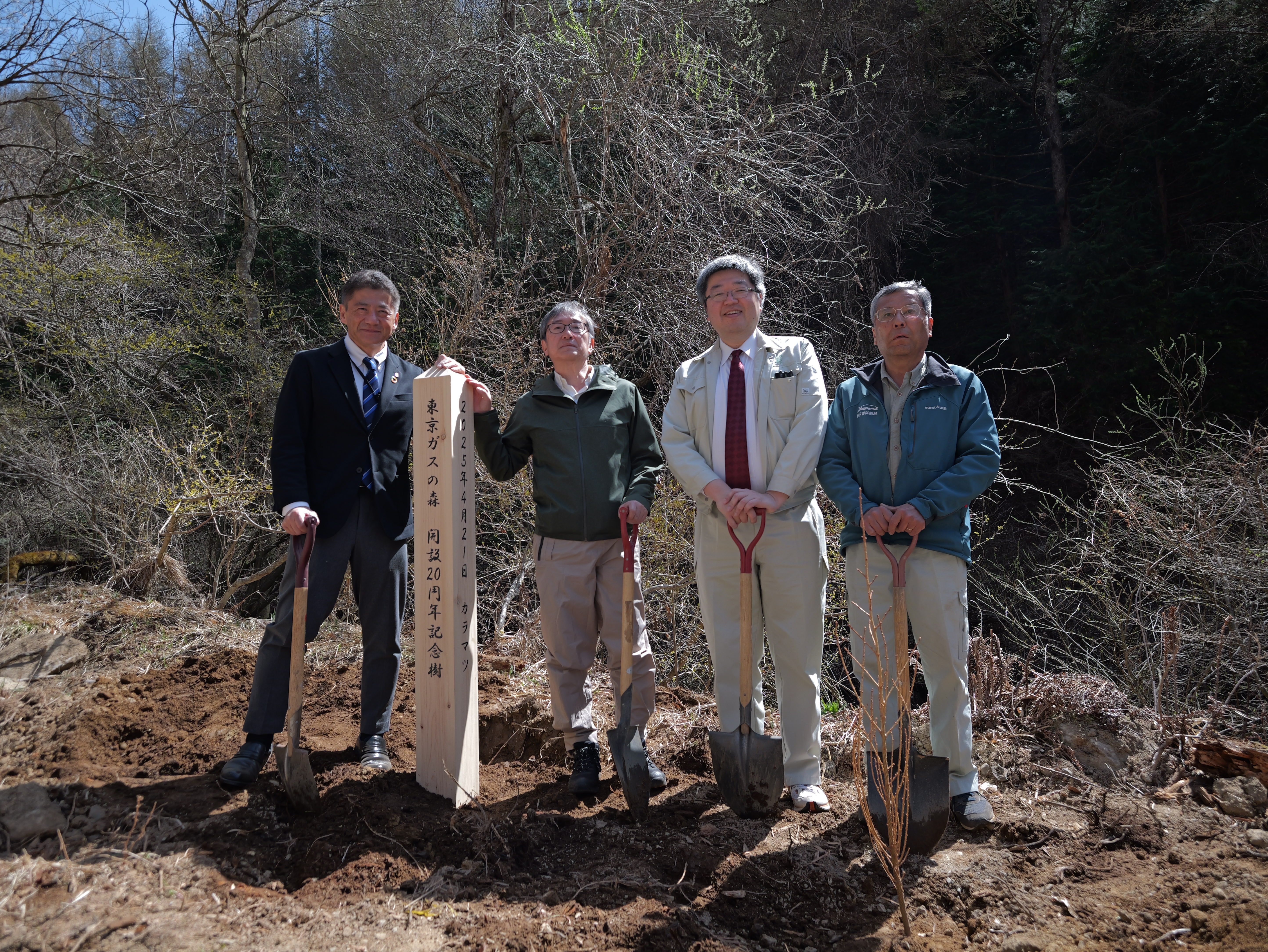 2025年、東京ガスの森は2005年の開設から20周年を迎えました。これを記念して、2025年4月に森が位置する御代田町の小園拓志町長、森の維持管理を委託している佐久森林組合、そして生物多様性の調査を委託している浅間自然環境事務所の方々をお招きし、長野都市ガス株式会社と共同で、現地で20周年記念式典を開催しました。式典では安全祈願の他、カラマツの記念植樹や皆伐エリアへの記念植林、トレイルウォークを実施しました。