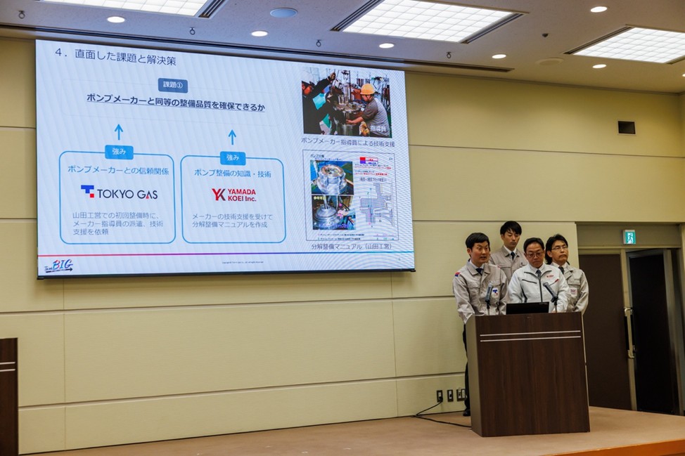 東京ガス袖ケ浦LNG基地には100台以上のポンプ(LNG用・LPG用)があり、その分解整備をメーカーに依頼していましたが、基地内にポンプ整備場を建設しサードパーティー化に着手しました。3社それぞれの強みを活かして取り組んだ結果、整備品質の確保、トラブル発生時の適切な対応といった課題を乗り越え、コスト・納期とも50%削減を実現。協働によりトラブル対応力の向上、実践知の習得による若手の育成といったシナジーも生まれました。