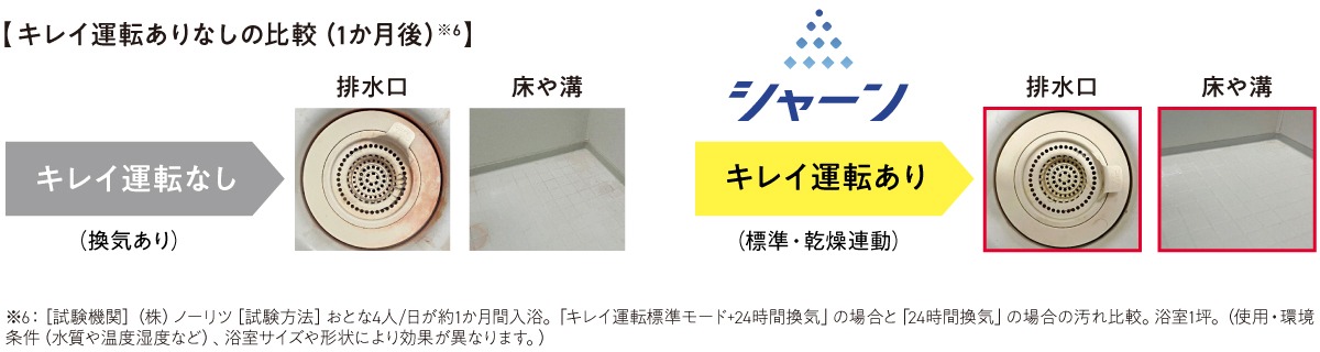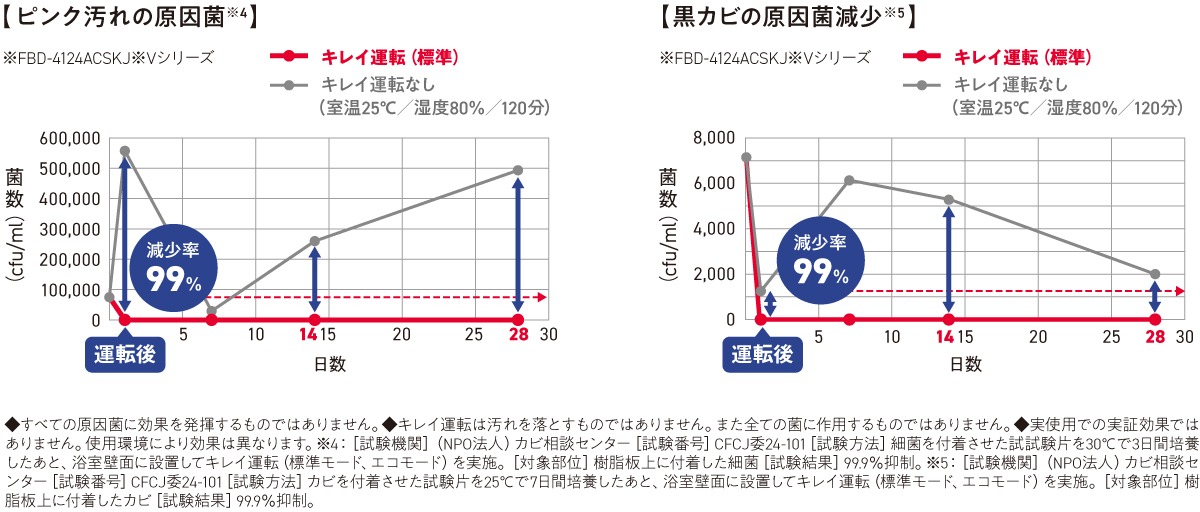 *5:[試験機関](NPO法人)カビ相談センター[試験番号]CFCJ委24-101[試験方法]カビを付着させた試験片を25℃で7日間培養したあと、浴室壁面に設置してキレイ運転(標準モード、エコモード)を実施。[対象部位]樹脂板上に付着したカビ[試験結果]99.9%抑制