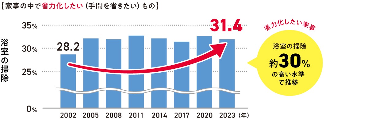 共働き世帯の増加に伴い、時短家電や便利アイテムの人気が高まっています。しかし、浴室の掃除は依然として人手に頼る部分が多く、負担を感じる方が少なくありません。東京ガス都市生活研究所【*2】の調査結果【*3】でも、家事のなかで「省力化したい(手間を省きたい)」項目の1位に「浴室の掃除」が挙がっており、過去から一貫して約3割の高い割合で推移しています。