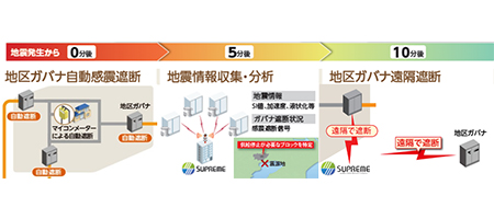 各センサーからリアルタイムに取得した情報を「SUPREME」に連携することで、被害エリアでの迅速なガス供給停止と安全なエリアへのガスの安定供給を両立することができます。