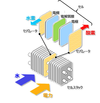 *1:水を電気分解して水素と酸素を生じさせる(燃料電池とは逆の反応)薄い部品(セル)を複数積層させたもの。