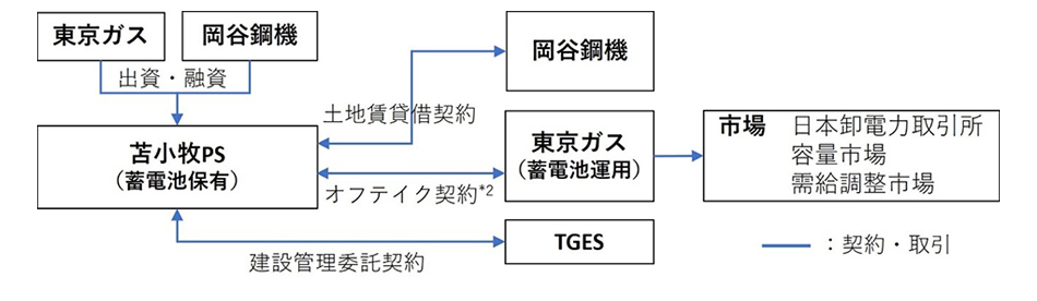 *2:供給者と購入者の間の、供給者が提供する予定の商品やサービスの全部または一部を購入または販売するための取り決め(経済産業省「GXスタートアップの創出・成長に向けたガイダンス【抜粋版】需要創出 ~LOIやオフテイク契約の締結~」より抜粋)。本件では東京ガスが20年間にわたり利用対価を苫小牧PSに対し支払い、系統用蓄電池の運用権を得る。