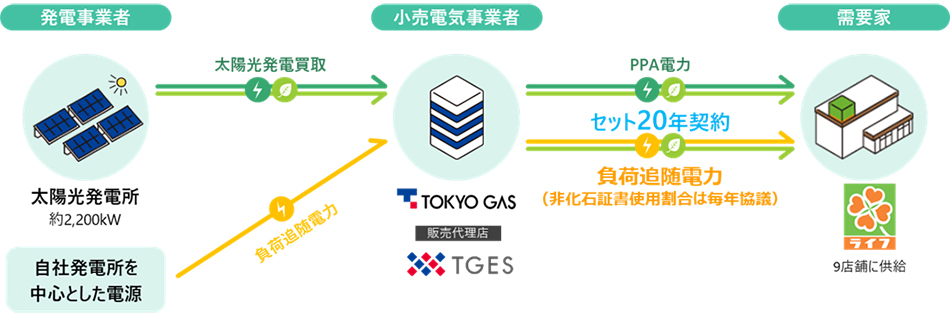 株式会社ライフコーポレーション(社長:岩崎 高治、以下「ライフコーポレーション」)、東京ガス株式会社(社長:笹山 晋一、以下「東京ガス」)、および東京ガスエンジニアリングソリューションズ株式会社(社長:小西 康弘、以下「TGES」)の3社は、ライフコーポレーションの首都圏9店舗へオフサイトコーポレートPPA*1スキーム(以下「本スキーム」)による再エネ電力の供給を実施することに合意しました。