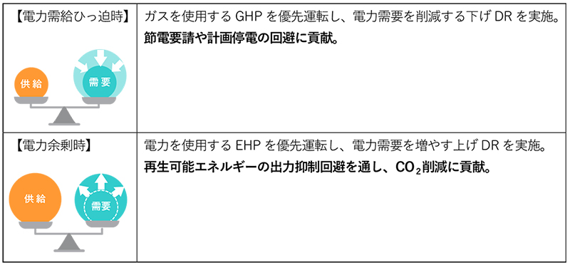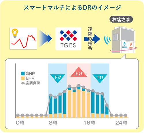 本サービスは、TGESが、スマートマルチを電力の需給バランス等に応じて自動で遠隔制御するものです。追加設備の導入や特別な操作・作業を必要とせず、空調の快適性を維持したまま、調整力を創出します。具体的には、電力需給ひっ迫時等においてはGHPを優先的に運転する「下げDR」、電力余剰時等においてはEHPを優先的に運転する「上げDR」を行うことで、需給バランスの調整に貢献するとともに、DRの実績に応じた報酬を得ることができます*3。