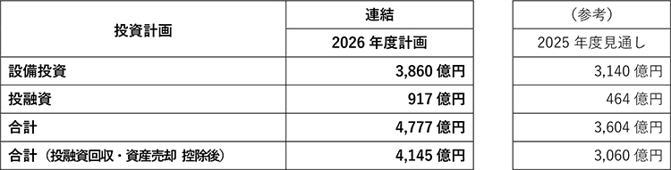 2026年度は、連結で4,777億円の投資を計画しています。なお、投融資回収、資産売却によるキャッシュイン(簿価相当)を控除した投資合計は4,145億円を計画しています。「2026-2028年度 中期経営計画」で示した戦略に沿い、利益成長、資本効率向上、安定的収益基盤の維持に必要な投資の厳選と資産の入替を実行します。