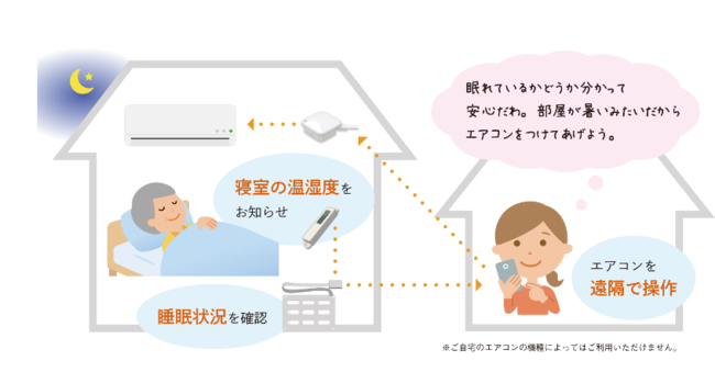 寝室の温度や湿度が高く(低く)なったら、専用アプリに通知し、エアコンを遠隔で操作(※2)することができ、熱中症になりやすい季節もご家族の安心をサポートします。