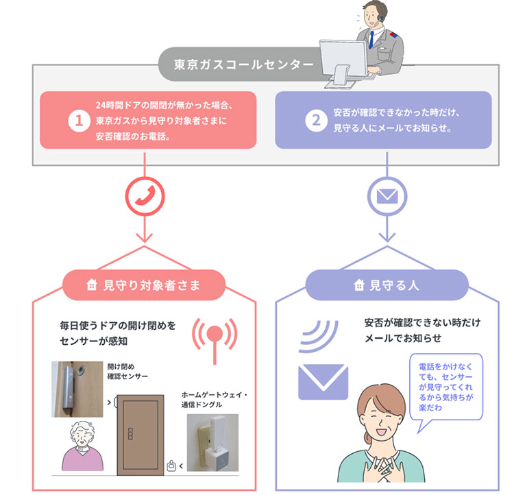 24時間ドアの開閉が無い場合に、東京ガスのコールセンターから見守られる方に安否確認のご連絡をします。