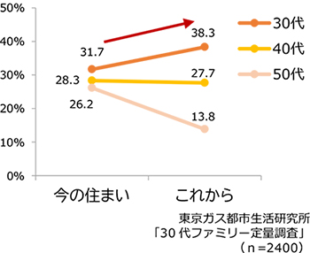 コロナ禍の影響でリモートワークが増加し、「住む場所の選択肢が広がった」と感じられる一方で、仕事のために部屋数が足りないと感じる人も多くいました。部屋数や全体的な広さを求める傾向は、上の年代よりも30代ファミリーで強くなっています。住まい選びも、「部屋数の多さ」がこれまでよりも重視されています。