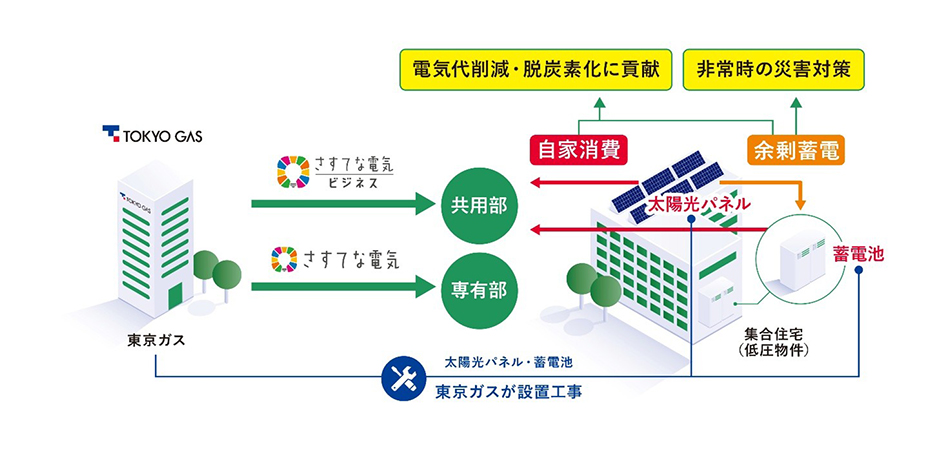 東京都では2025年4月から、新築集合住宅等における太陽光発電設備(以下「PV」)の設置を義務付ける制度が施行されました。PV導入は、共用部の電気代削減と脱炭素化に資する一方で発電と需要の時間帯が異なるため、昼の余剰電力活用の観点から蓄電池とセットでの導入が有効です。蓄電池導入にあたっては、集合住宅の仕様に応じた適切な容量の選定が課題となりますが、東京ガスはこれまで電力小売事業で獲得した電力需給に関する知見と床暖房設置工事等を設計・施工してきた人材を活用することにより、設計支援から施工まで一体で担うことができます。