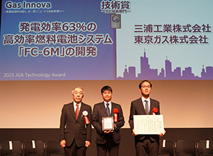 東京ガス株式会社(以下「東京ガス」)と三浦工業株式会社(以下「三浦工業」)が共同開発した世界最高レベルとなる発電効率63%*1の固体酸化物形燃料電池*2システム「FC-6M」(以下「本システム」)が、一般社団法人日本ガス協会主催「2025年度 技術賞(ガス技術部門)*3」を受賞しました。