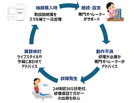 本サービスは、Assurant Japanグループが運営する家電製品の取扱説明書等の情報をスマートフォンアプリやパソコンで一元管理できる「トリセツ*2」のサービス上で提供するものであり、機器購入から買替検討に至るまで、家電製品のライフサイクルの各フェーズにおけるお客さまの課題やニーズにお応えします。