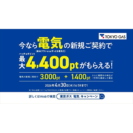 | 対象メニュー | 東京ガスの電気料金メニュー「基本プラン」または「ずっとも電気3」 |