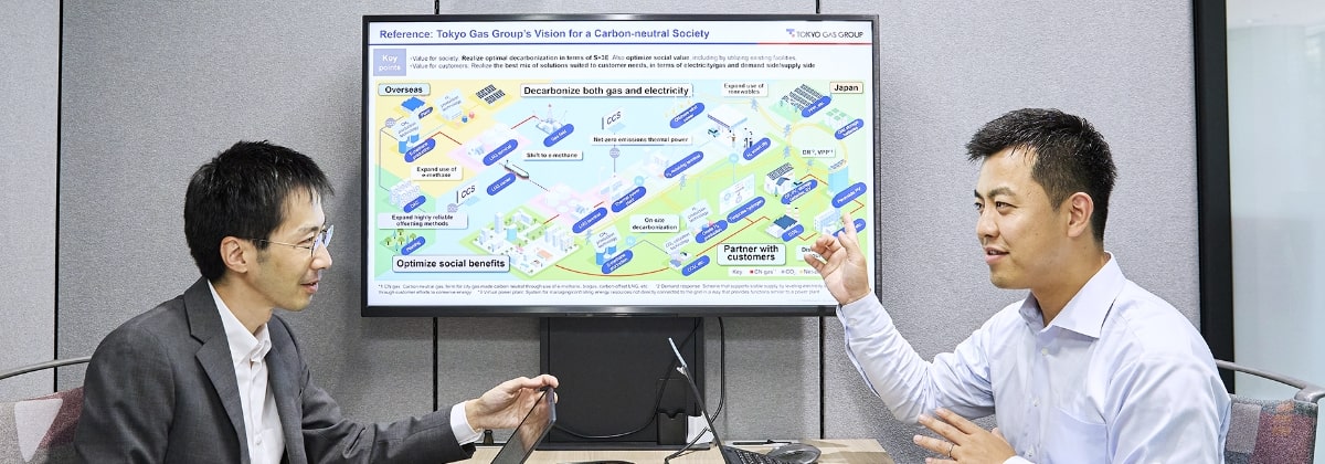 その通りですね。エネルギー供給という社会的な使命と、e-メタンのような新しい分野への挑戦。この両方が高いレベルで両立しているのが、東京ガスの魅力だと思います。世間が東京ガスに対して持っているイメージよりも自由度が高く、若手にも大きなチャンスが与えられる会社です。私もLNG基地での経験を経て、このプロジェクトに参加する機会を得ましたが、これまでのキャリアで培った経験を最大限に活かすことができ、充実しています。脱炭素は先の長い壮大な取り組みですが、私たちは今、「長い道のりの1ページを書いている」という感覚です。気候変動という大きな課題に対し、これは誰かがやらなければならないことであり、エネルギーで社会を支えてきた東京ガスが先頭に立ってやるべきこと。その責任とやりがいを感じながら、日々業務に向き合っています。