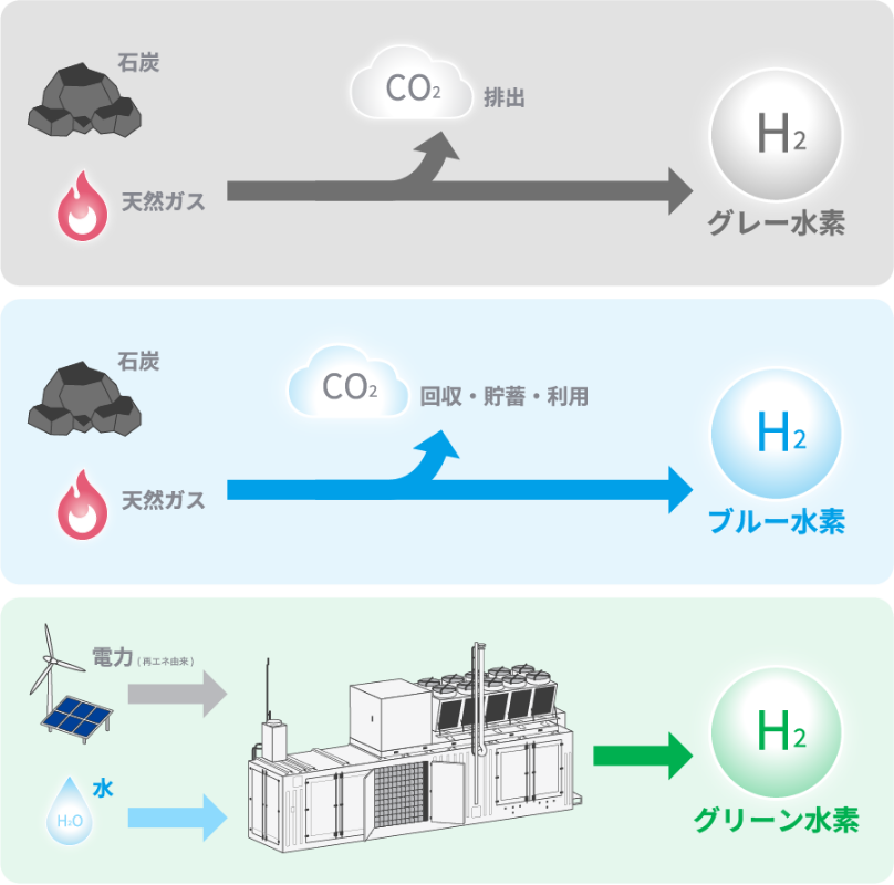 水電解装置は水素を製造するための装置であり、再生可能エネルギー(再エネ)由来の電力で製造された水素をグリーン水素と呼びます。